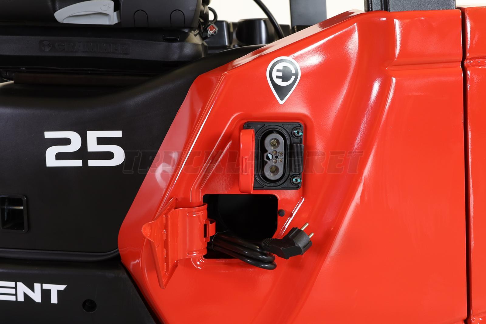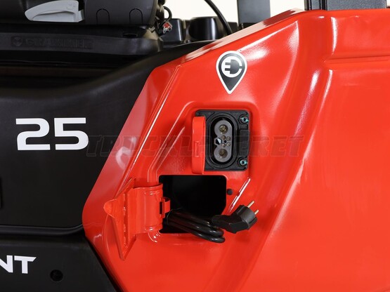 **Dobbelt lade mulighed: integreret oplader for den fleksible løsning - ekstern lader for den hurtige opladning. Begge dele let tilgængelig fra venstre side på trucken